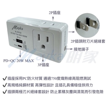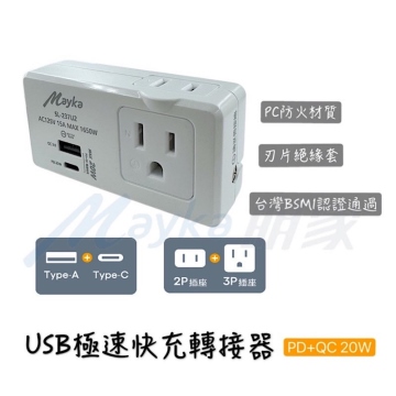 {{ INAME || '【Mayka明家】PD+QC 20W USB極速快充轉接器 2插座(2P+3P) SL-237U2'}} 產品代號 : {{INAME}}