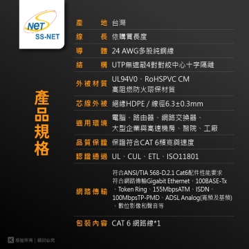 • ★Cat.6跳接線為24AWG 軟線(多股銅),使用 50u”鍍金 RJ45 接頭(PLUG),專利內部支架為上下錯位 V 槽穿線孔,好入線且有效防止串音產生